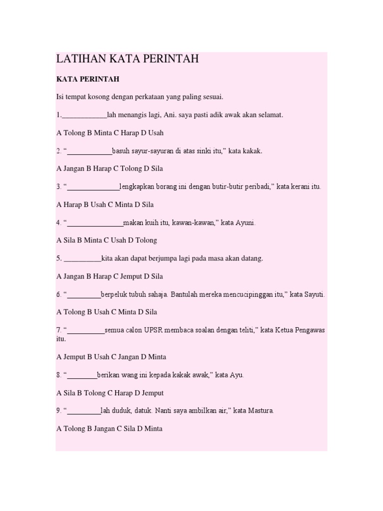 Contoh Kata Perintah Tahun 1 from imgv2-1-f.scribdassets.com Kalimat perintah (materi kelas 2 tema 1). Tahap 1 kata ganda penuh tahun 3. Kata perintah ialah ayat yang diucapkan dengan tujuan 3. Belum tentu si tukang perintah juga bisa melakukan apa yang dia perintahkan. Ayat perintah tahun 3 by dvya selvakumar 11034 views. Wah pas banget kamu masuk halaman ini. Pernahkah sobat ingin menyampaikan sesuatu kepada seseorang namun merasa tidak enak, atau sungkan bahkan. Tolong kembalikan buku cerita saya.