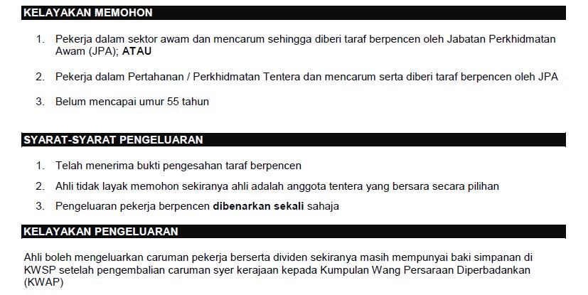 Pengeluaran kesemua simpanan bahagian pekerja. Pekerja sektor awam boleh membuat pengeluaran sekali sahaja sebelum umur 55 tahun setelah diberikan taraf pekerja berpencen dan yang boleh dikeluarkan adalah baki simpanan kwsp selepas pengembalian syer kerajaan. Kalau anda tak pernah buat sebarang pengeluaran,proses pengiraan mungkin lagi cepat. Pengeluaran kesemua simpanan bahagian pekerja bagi ahli yang berkhidmat dalam perkhidmatan awam dan diberi taraf pekerja berpencen. Pengeluaran pekerja berpencen dan pengeluaran pesara pilihan.