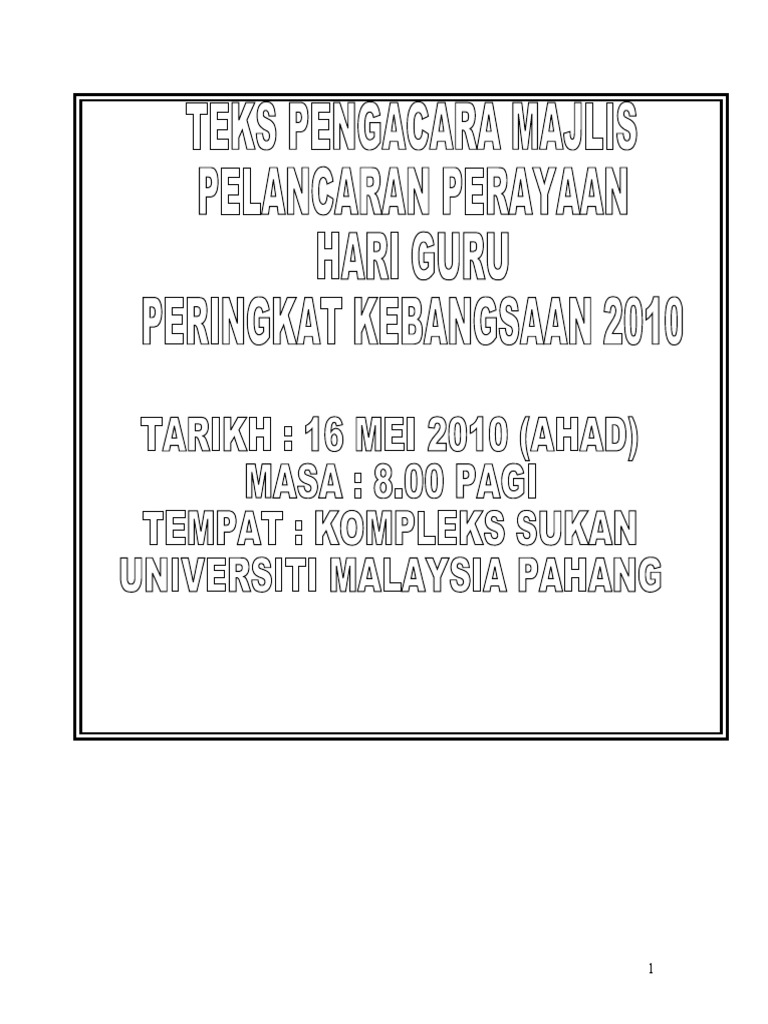 Teks Ucapan Pengacara Majlis hari anugerah from imgv2-1-f.scribdassets.com Koleksi hariff @teks pengacara program seminar kes. Hari yang berbahagia penuh bermakna. Skrip pengacara majlis ramah aidil fitri smk simanggang 2016. Cikgu aina @teks pengacara majlis hari guru. Skrip pengacara majlis sambutan hari raya 2012. .pergerakan (pkp) apabila menyertai majlis hari raya pada hari raya pertama bersama pemimpin dan pelajar di universiti putra malaysia (upm). Sempena sambutan hari penguatkuasa, jabatan penguatkuasaan dbkl jpk #dbkl #jpk. Pengacara majlis (master of ceremony) oleh :