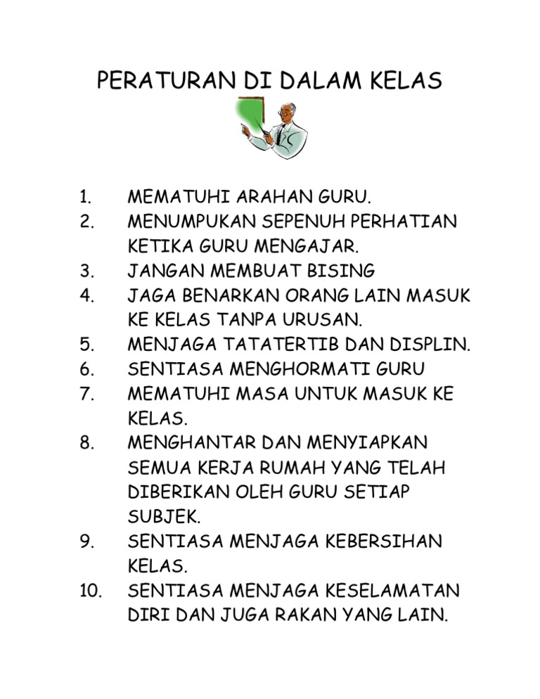 Peraturan Bilik Disiplin Docx Document from reader015.staticloud.net Kelas adalah sebuah ruangan yang digunakan untuk kegiatran belajar dan mengajar yang umumnya berisi. Pay attention in class = memperhatikan di kelas. Peraturan dibuat agar sesuatu berjalan denga tertib dan seksama sesuai dengan apa yang diharapkan dari si pembuat peraturan. Apakah anda boleh memiliki permen karet, menggunakan computer, atau meminjam pensil kemungkinan akan berbeda dalam banyak kelas anda. Kami menyediakan aneka peraturan di dalam kelas yang bisa anda pesan online. Kaitannya dengan pengubahan tingkah laku, dalam membentuk tingkah laku yang baik pada siswa diperlukan adanya peraturan. Waktu itu hari pertama gw masuk kelas 3. Selama perjalanan kami sudah banyak bercerita, dari tanya jawab tentang pekerjaan dia sampai pekerjaanku.