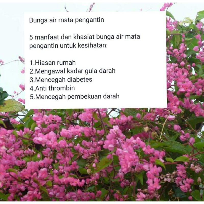 Buy Biji Benih Pokok Air Mata Pengantin Pink Antigonan Ready Stok 50 Biji Seetracker Malaysia from cf.shopee.com.my Bunga air mata pengantin merupakan tanaman yang berasal dari meksiko dan tumbuh di banyak negara salah satunya indonesia. Rasakan terapi alam di rumah sendiri tanpa biaya yang mahal dengan desain. Tetapi bagi sesetengah pengusahapertanian, pokok air mata pengantin dianggap sebagai rumpai yang perludihapuskan, manakala pencinta landskap, tumbuhan ini dianggap tanaman penghiastaman terutama pada pergola atau gazebo yang sangat indah. Ekstrak dari daun dan bunga pokok air mata pengantin merupakan penghalang pengoksidaan lipid. P asaran kelulut yang makin meluas di malaysia membuatkan ramai pengusaha baru yang ingin menceburkan diri dalam perusahaan lebah jenis tidak menyengat ini. Umumnya di indonesia membudidayakan spesis antigonon leptopus, spesis indah dan menarik dijadikan hiasan. Bunganya yang terbentuk dari tiga kepolmpok seperti mahkota dan kelompok bunga terluar bulat telur atau menyerupai jantung, sedang bentuk dua kelompok berbentuk mahkota yang lebih dalam lebih runcing. Cara menanam bunga air mata pengantin dalam pot bagi pemula by princes posted on december 13 2017 december 6 2017 panduan cara menanam dan merawat bunga air mata pengantin sebagai tanaman hias di rumah.