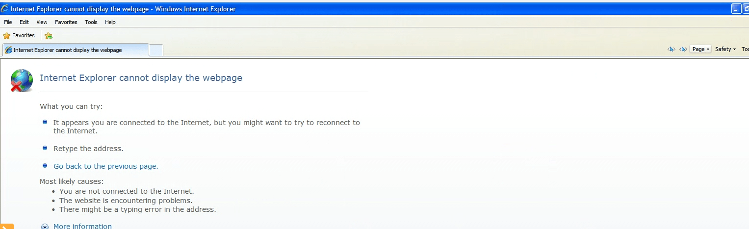 You get the internet explorer cannot display the webpage error when ie cannot access the internet. If while browsing the internet, your internet explorer gives you an error internet explorer cannot display the webpage, then this article may interest you. If internet explorer won't display webpages at all, it's unlikely that outdated windows version is the core issue, but you should rule out the possibility. This problem may occur when you access a web site that uses both ipv4 and ipv6 as the internet protocol version. I have connectivity and accessing other websites works just fine so i don't know why i am getting this error.